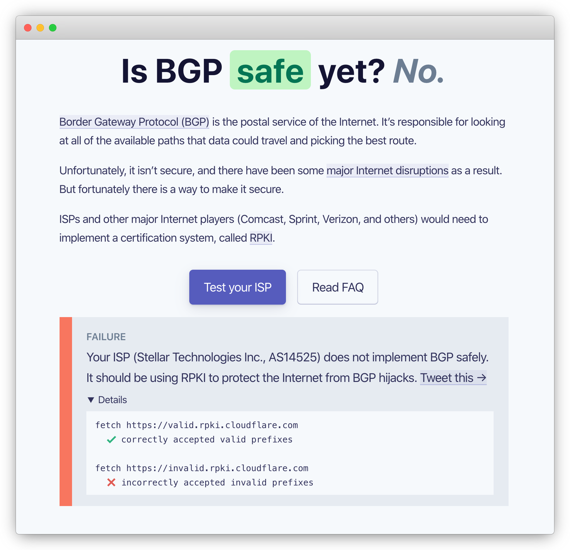 To date, Cloudflare has been doing fantastic work related to routing security in the internet operator community; they're probably the largest vocal advocate of RPKI adoption in the world. However, the release of isBGPSafeYet.com has been very controversial in the community, and with good reason.