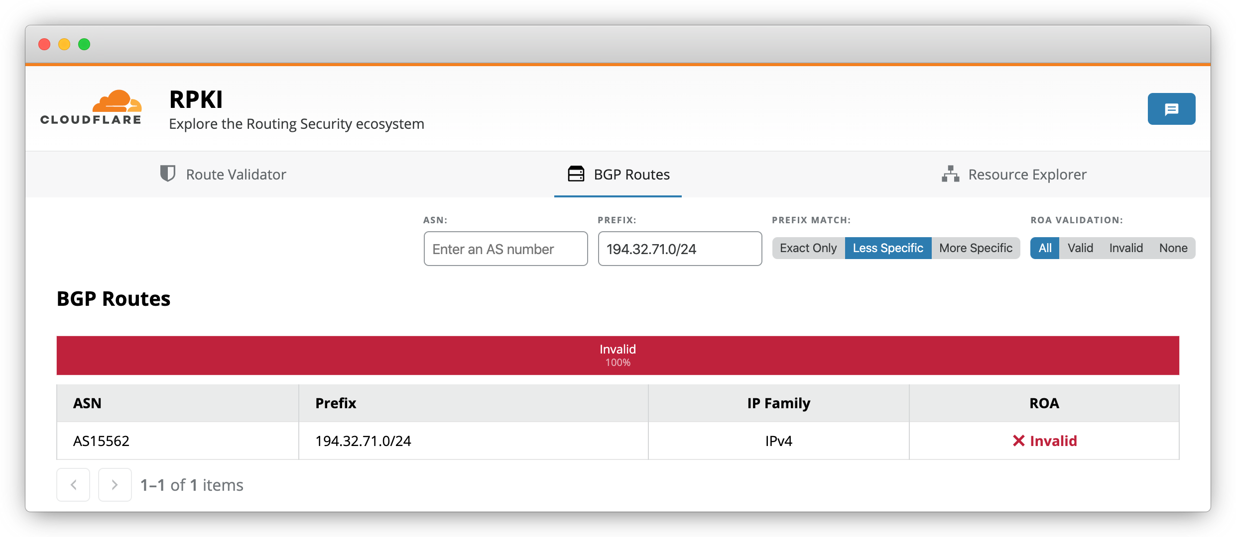 A couple of highly-respected network engineers (@Benjojo12, @JobSnijders tested Cloudflare's own claim to "implement BGP safely", and found some interesting results. They intentionally advertised a network onto the internet — 194.32.71.0/24 — from an invalid ASN, which should be considered an RPKI-invalid network. Cloudflare's own RPKI Validation Tool confirms this: